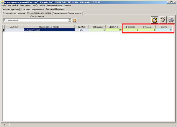 в окно "резерв товара для заказа" так и не смог добиться отображения чисел в полях "в резерве", "осталось"
