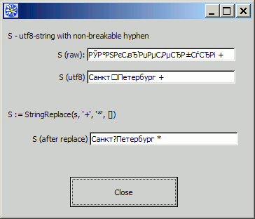 При преобразовании в стандартный string (для StringReplace) некоторые символы теряются — заменяются на вопросительные знаки, в частности символ неразывного дефиса (в UTF8 выглядит как $E2 $80 $91).