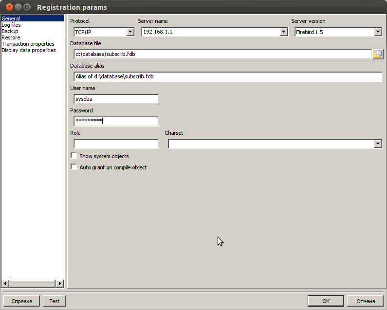 amateur писал(а):Во время регистрации базы, при нажатии ТЕСТ ругается на кодировку (че я уже не ставил, хотя база в сп1251).