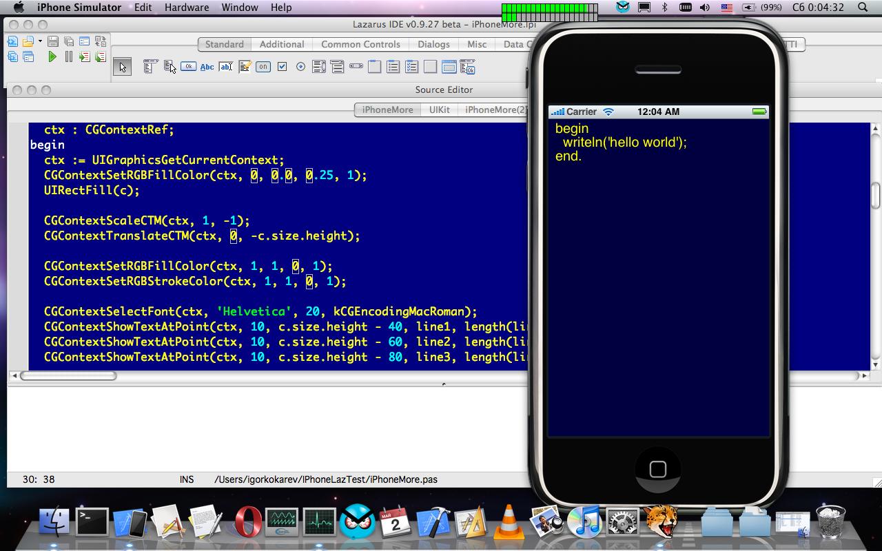 2) как конкретно Xcode заливает проги на iPhone доподлинно неизвестно. А это значит, чтобы залить прогу, придётся создавать FPC XCode проект. Лично меня это не радует, потому что я пишу с помощью Lazarus-а, и ковыряться с XCode, не охота (а надо). В планах написать конвертер Lazarus Project -> XCode project