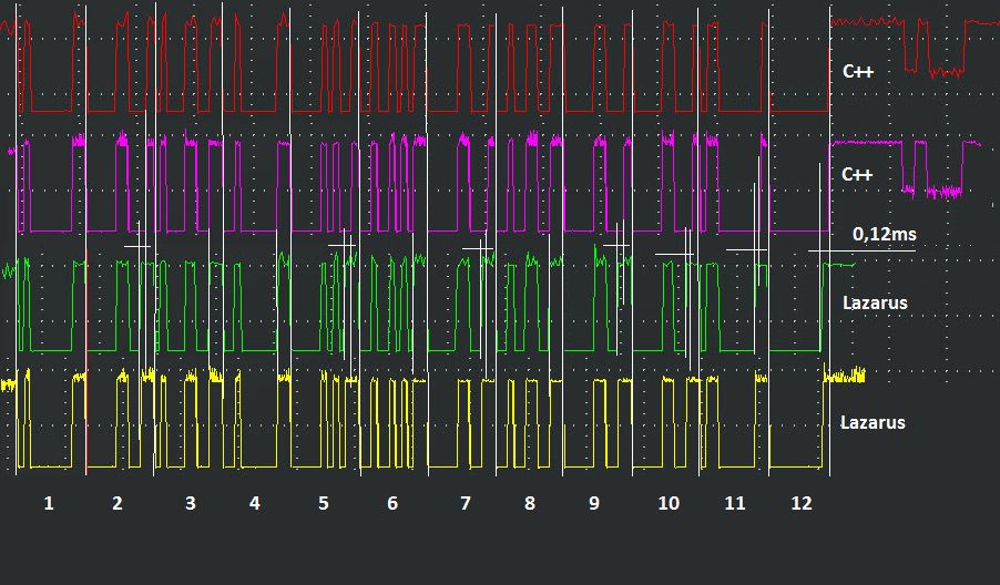 Явно видно, что при использовании Lazarus, длительность передачи "0" меньше, чем в программе, написанной на С++. Возникло подозрение, что какая-то проблема, связанная с RTS, поэтому снял осциллограмму непосредственно на выходе COM-порта компьютера: