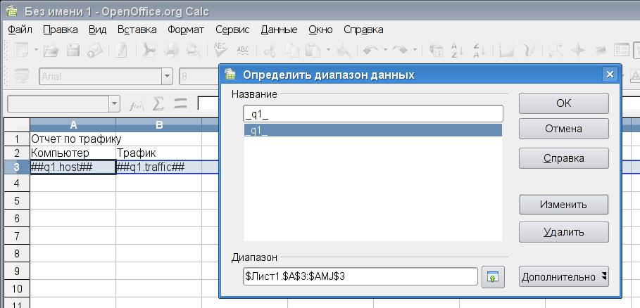 Т.е. если ты хочешь выводить данные из датасета q1, то нужно объявить диапазон данных в OOO Calc с именем _Q1_, в диапазон должна попадать строка 3, где ссылочки ##q1.host## и ##q1.traffic##