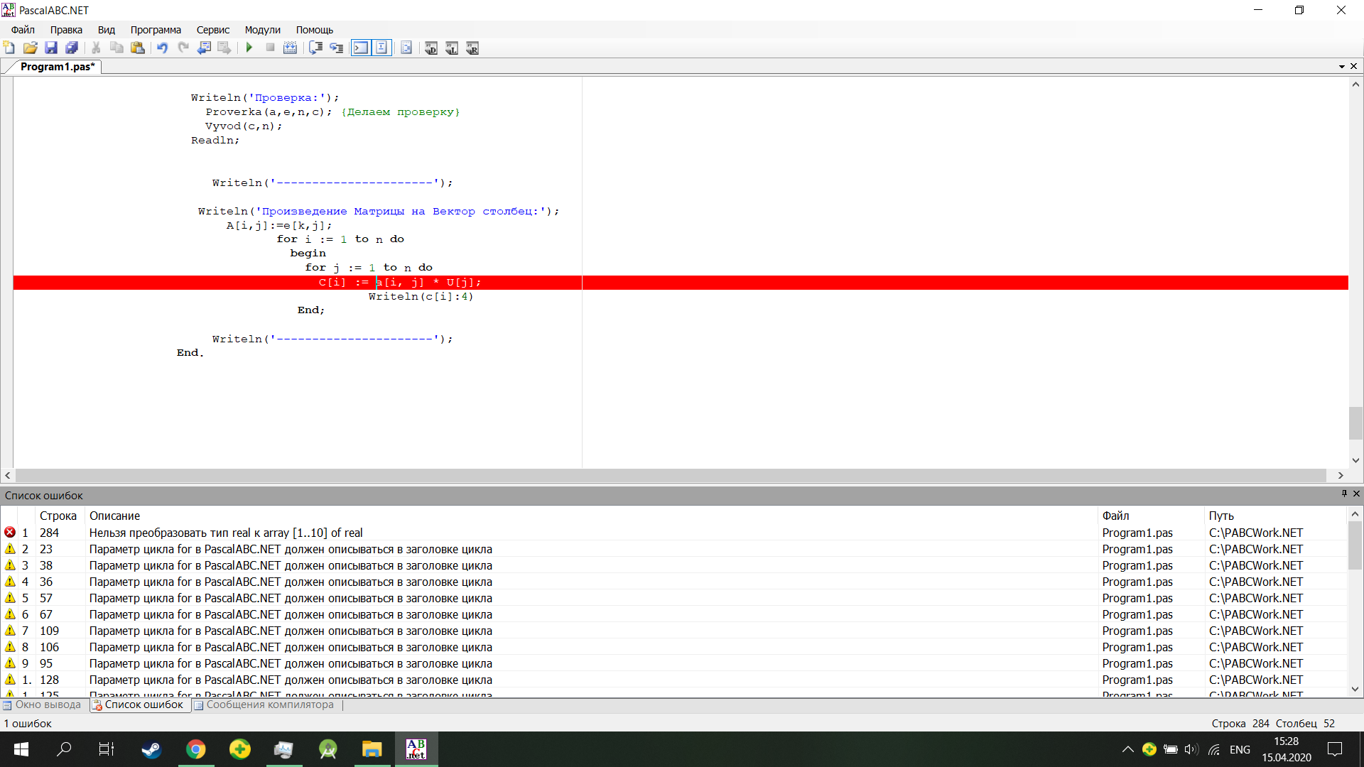 Ошибки в переменных цикла? или ошибки в переменных матрицы, хотя в матрицах ошибки нет, так как вывод вектор столбца верен.