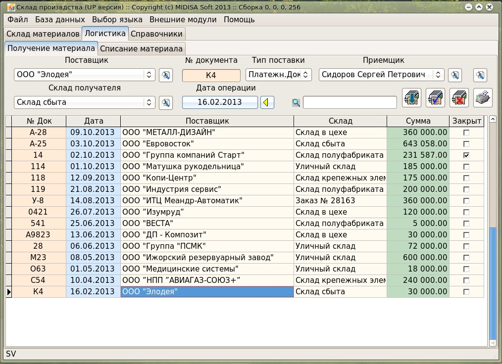 В шапке окна (да и на всех скриншотах) написано "Склад произвдства" -- т.е. пропущена буква "о".