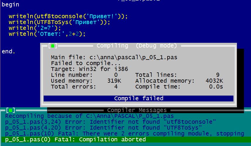 Подскажите, установлен FPC 2.6.4 при написании программы в операторе writeln используем русский текст. (writeln('Привет'))